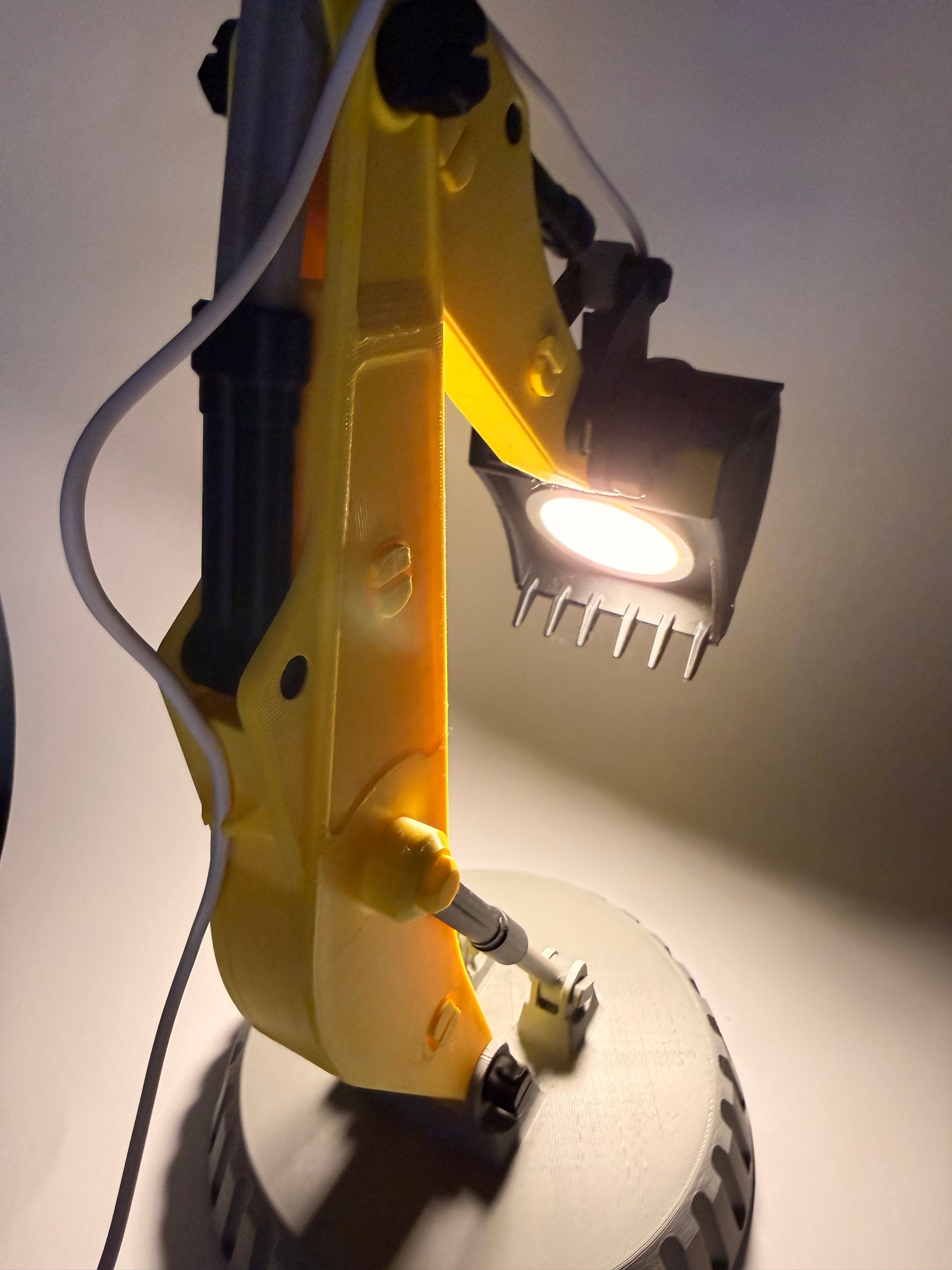 Baggerarm als voll bewegliche LED Lampe mit USB Anschluss und An/Aus Schalter.