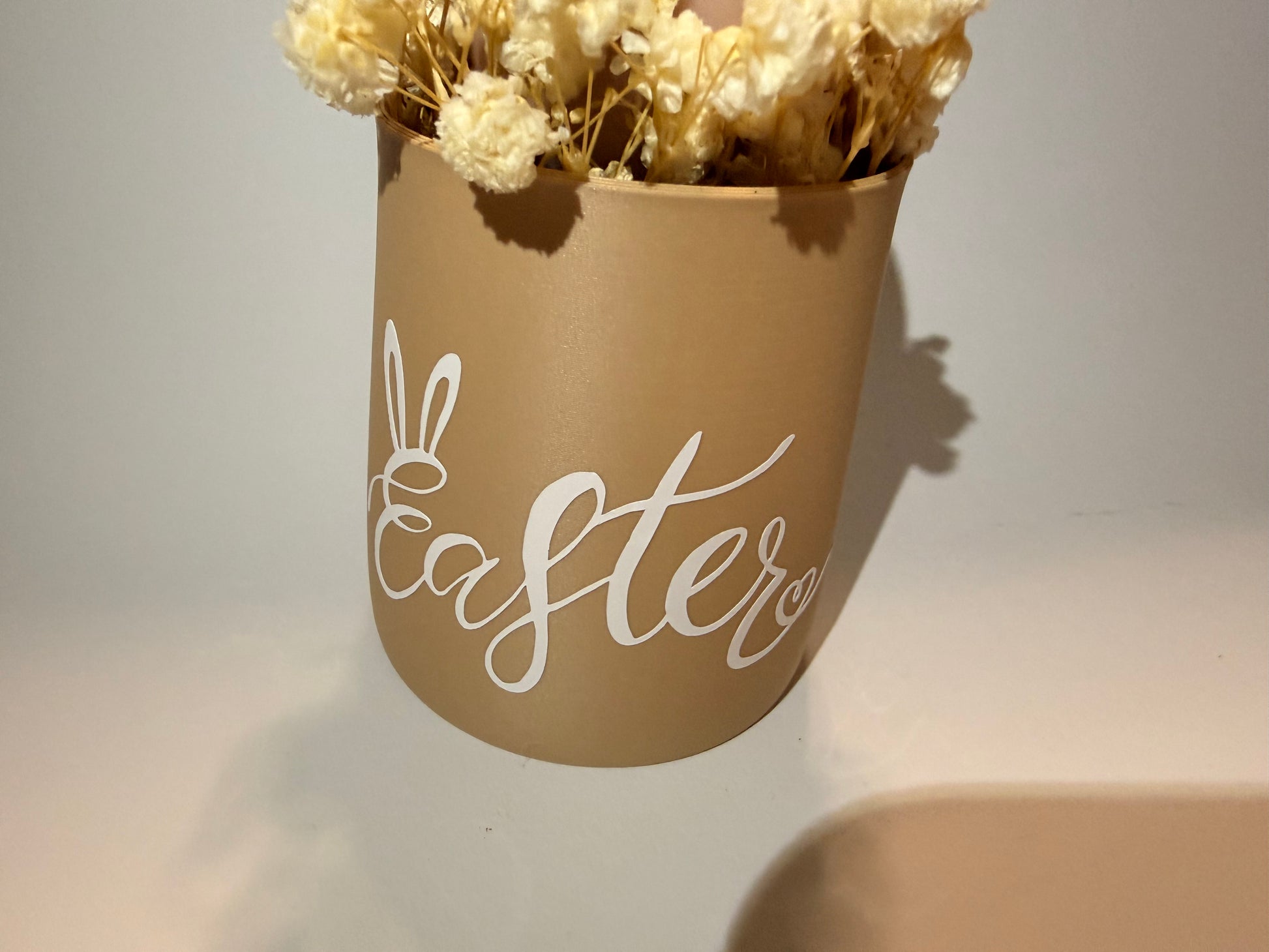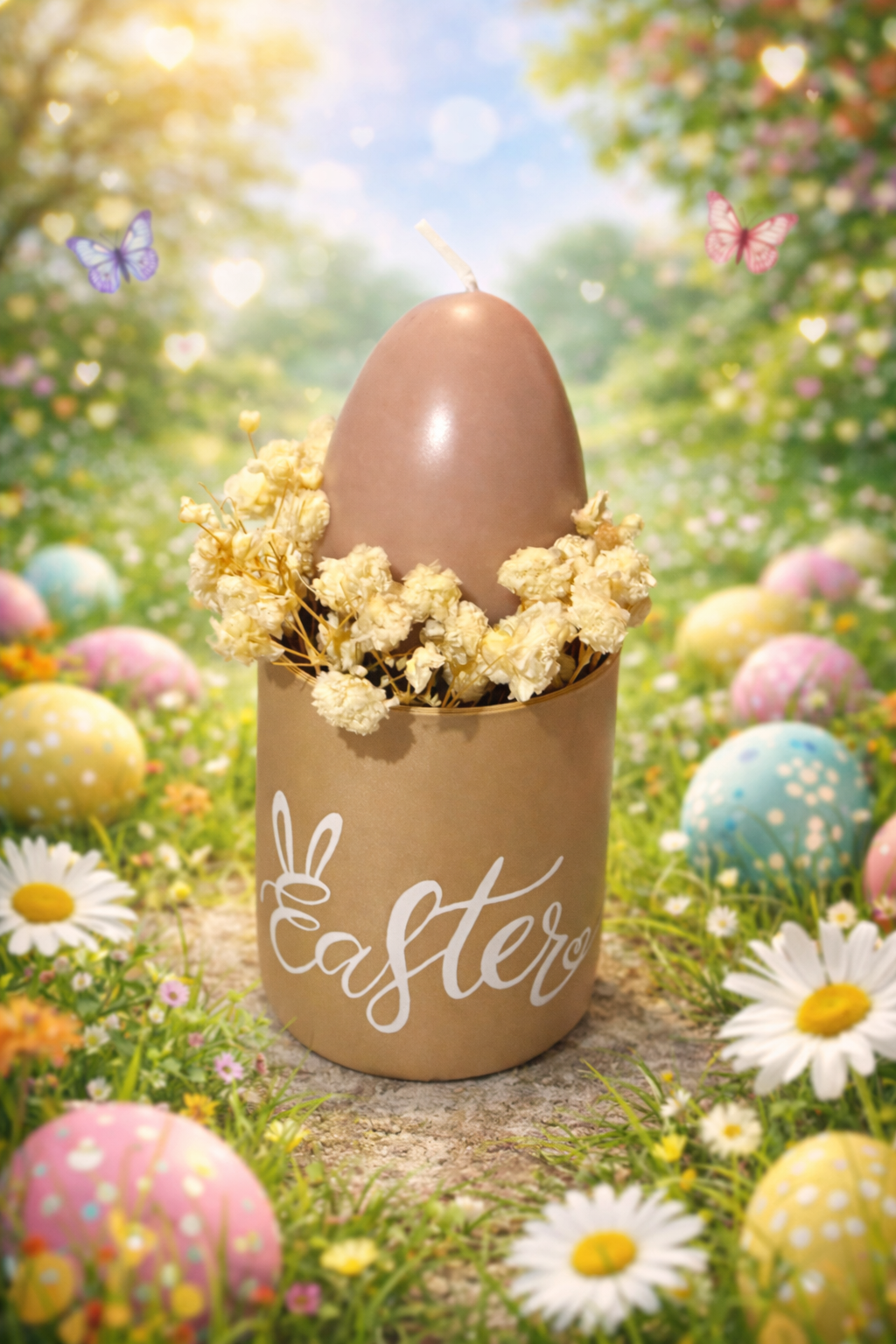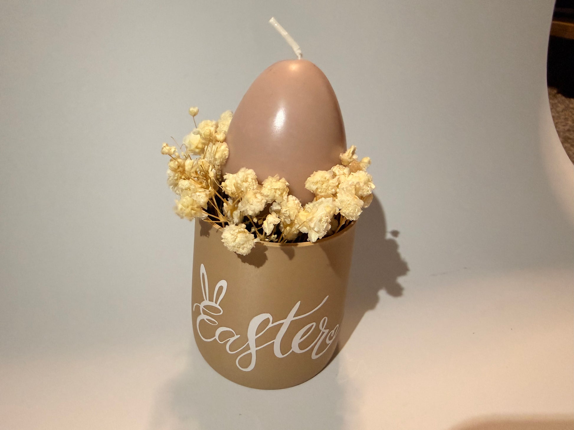 Kerzengesteck mit einem Osterei und Easter Aufschrift.