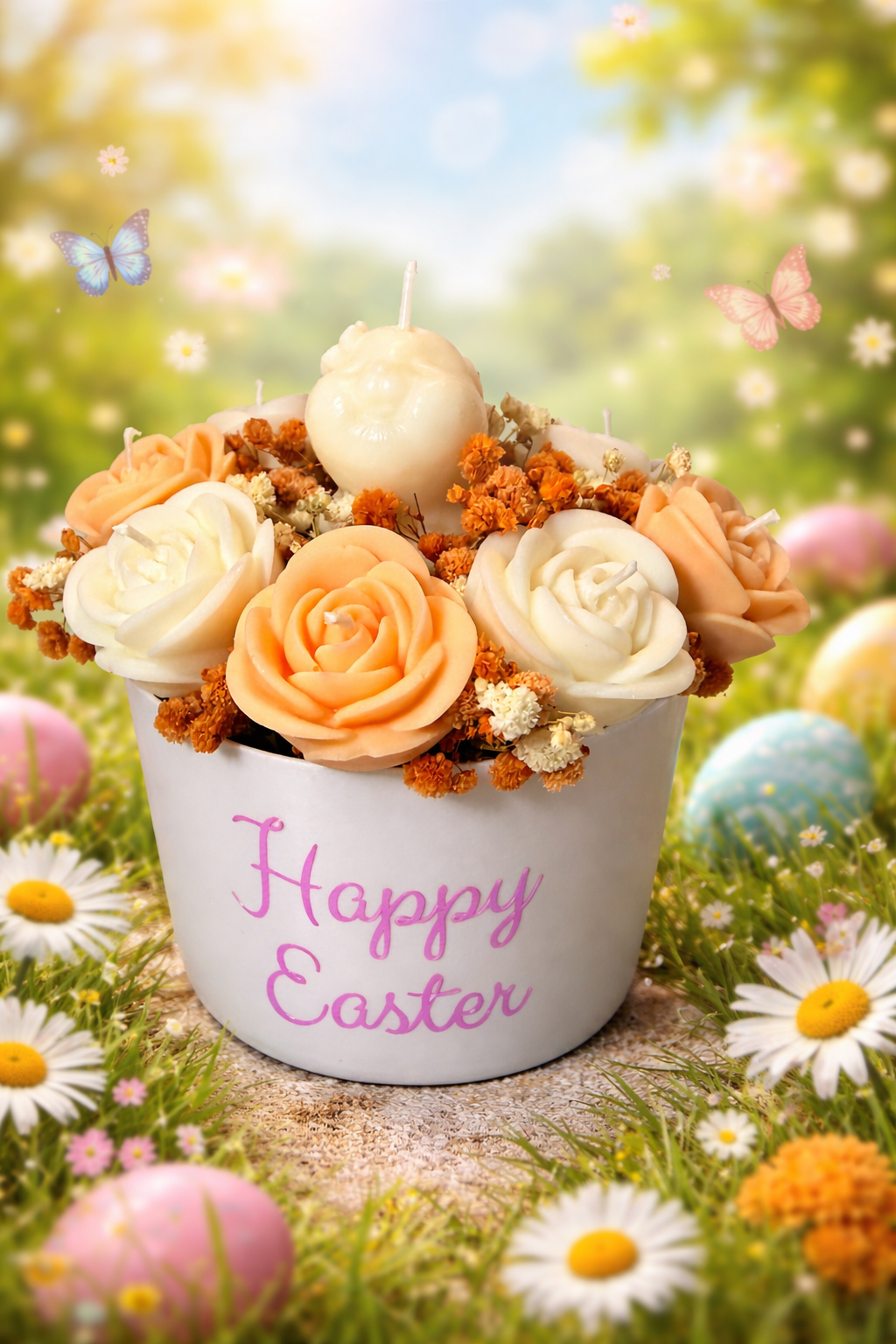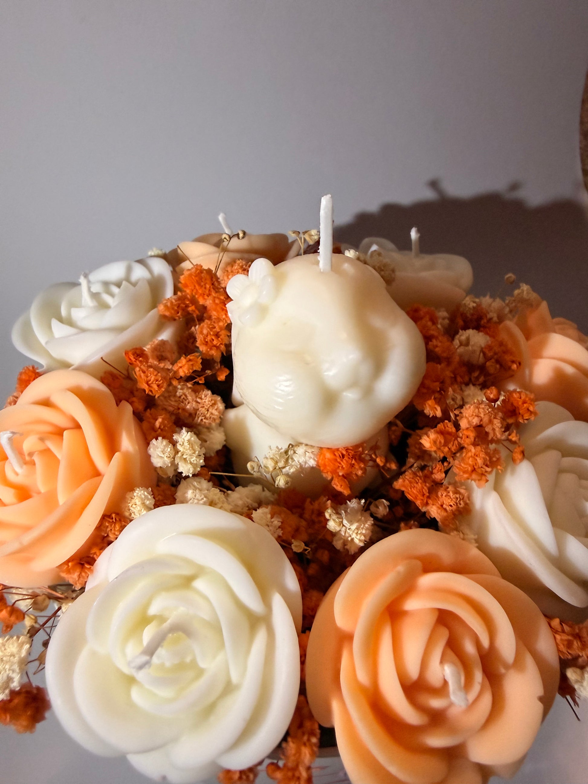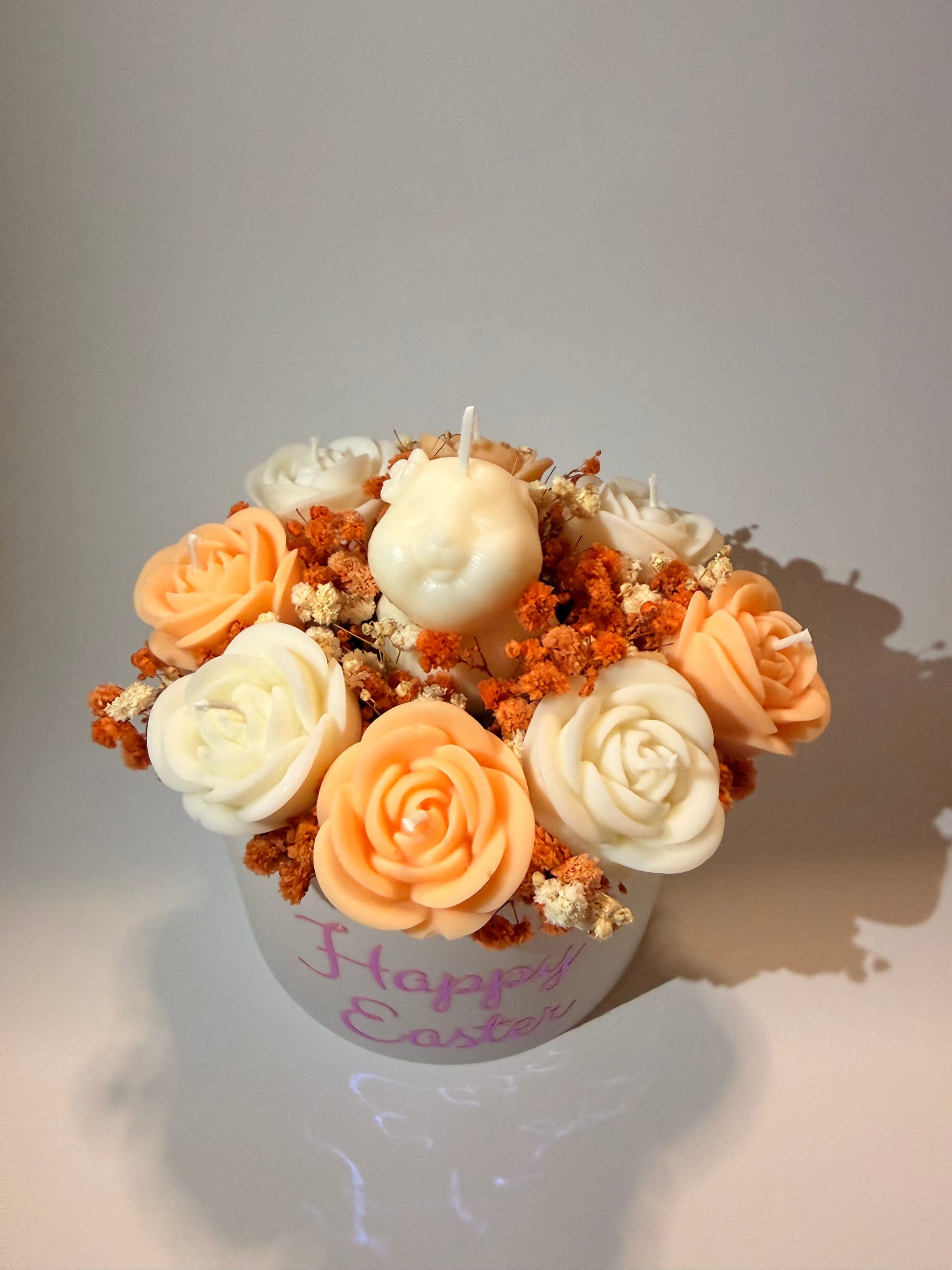 Kerzenstrauss mit 8 Rosenkerzen in weiß und Pastell Orange dekoriert mit Trockenblumen und einem süßen weißen Baby Häschen.